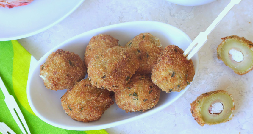 - Mix the filling ingredients. Stuff the green pitted olives with the filling, using and piping bag. Then flour them and put them in beaten eggs and then in bread crumbs