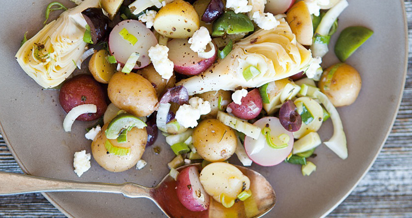 4. Mash the potatoes slightly and stir in the onions, Kalamata olives, salt and pepper.