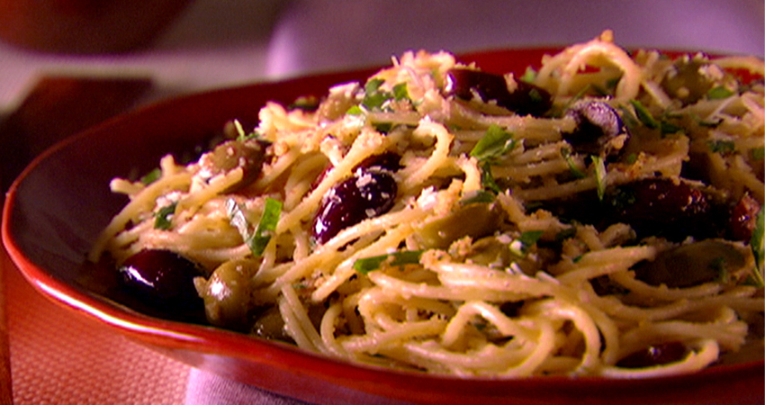 - Put the garlic and the pine nuts in a food processor until finely chopped. Add half of the Kalamata pitted olives and process until homogenized.