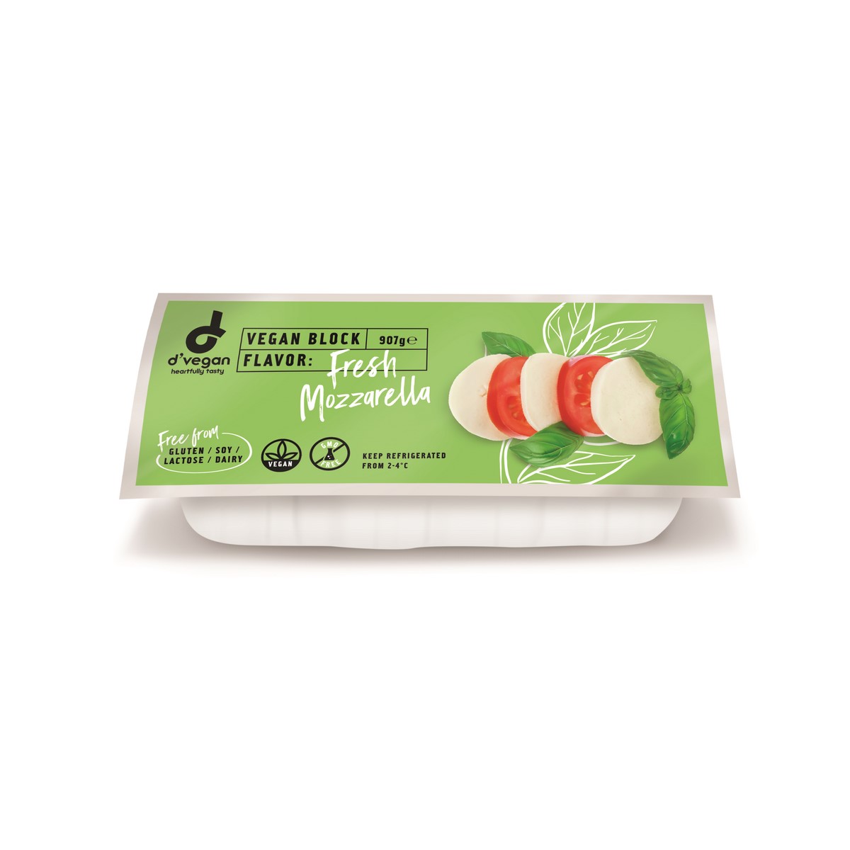 Vegan fresh mozzarella is a dairy-free, pillowy and moist white cheese. It has a very high moisture content, as such comes with a relatively short shelf life. Is free from dairy, gluten, GMO, soy, lactose. It is based on Coconut oil and is fortified with Vitamin B12.