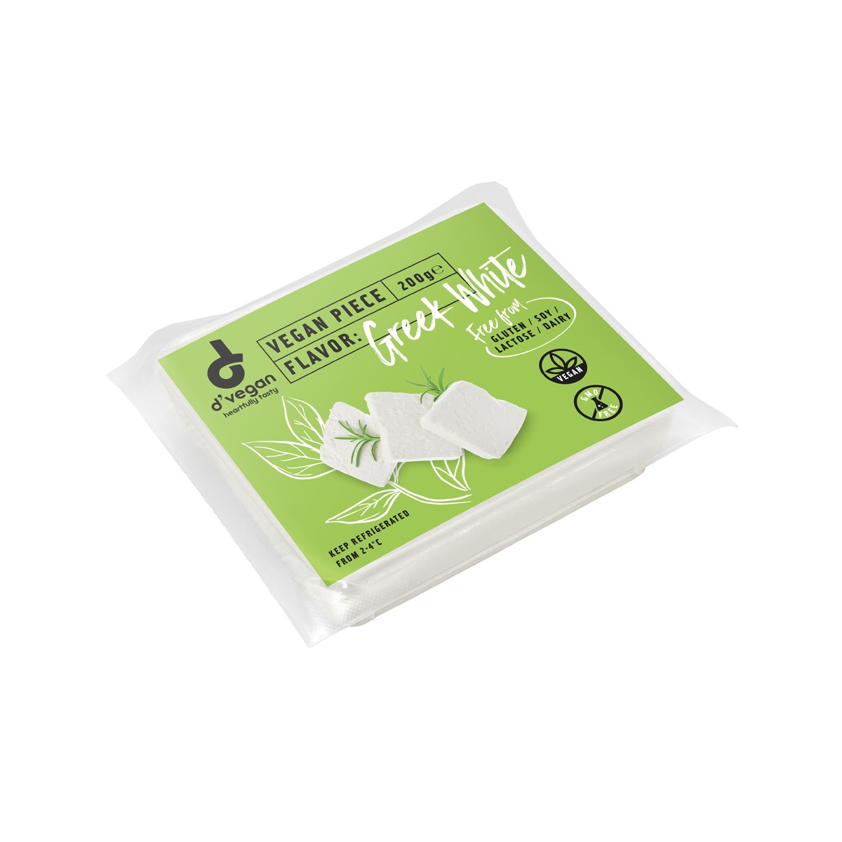 Greek vegan White has tangy, salty flavor and crumbly texture. Is free from dairy, gluten, GMO, soy, lactose. It is based on Coconut oil and is fortified with Vitamin B12.