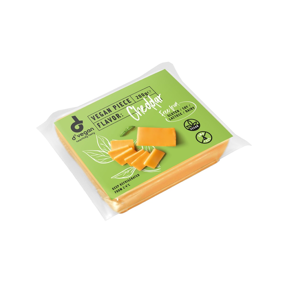 Vegan cheddar replicates the traditional cheddar in melting & tasting, elastic structure without breaking. It is ideal in recipes that need to melt, perfect as shredded. It is free from dairy, gluten, GMO, soy, lactose. It is based on Coconut oil and is fortified with Vitamin B12.