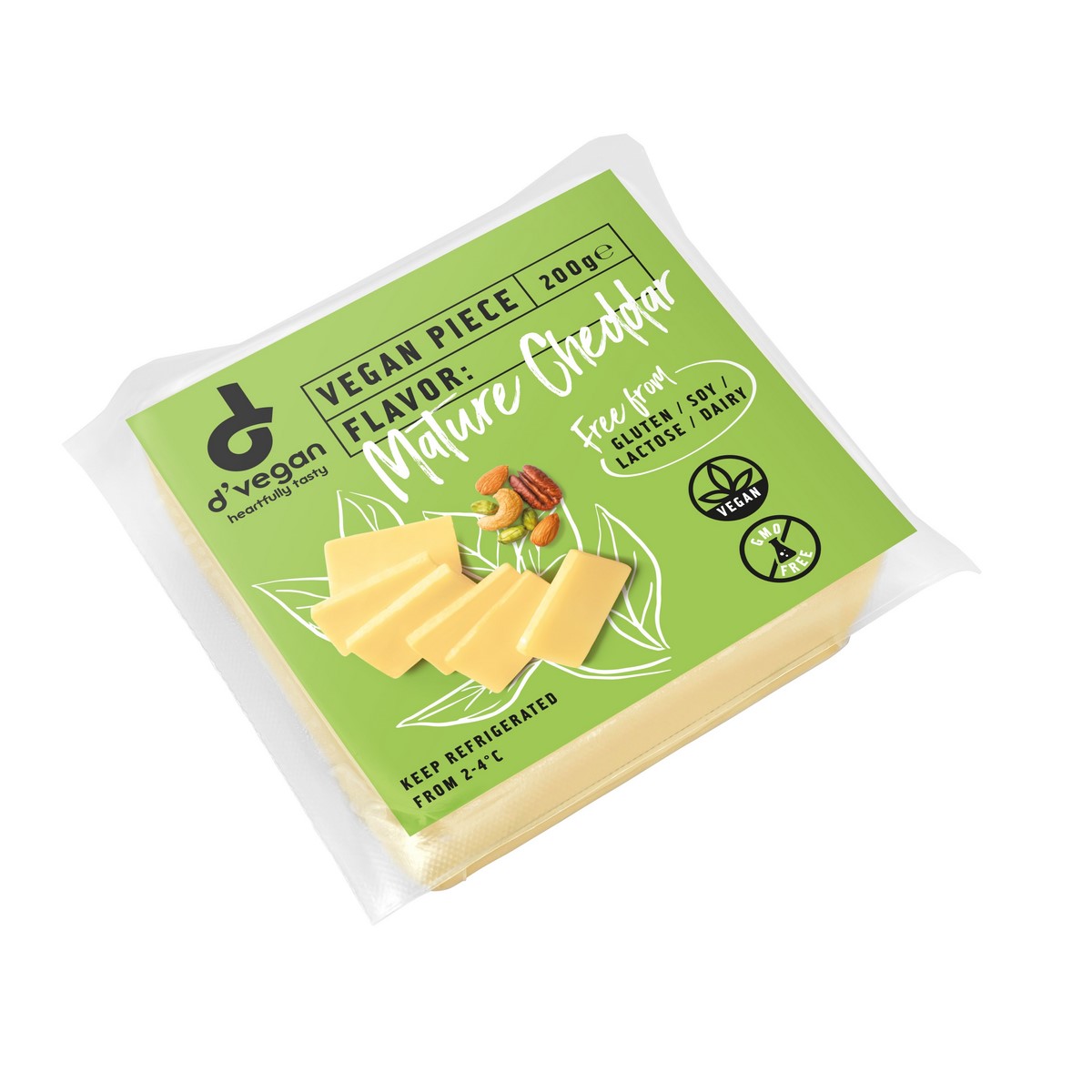 Vegan Mature Cheddar tends to have a characteristic sweet, nutty flavor. It has a firm body with a crumble and a strong, rich flavor. It is free from dairy, gluten, GMO, soy, lactose. It is based on Coconut oil and is fortified with Vitamin B12.