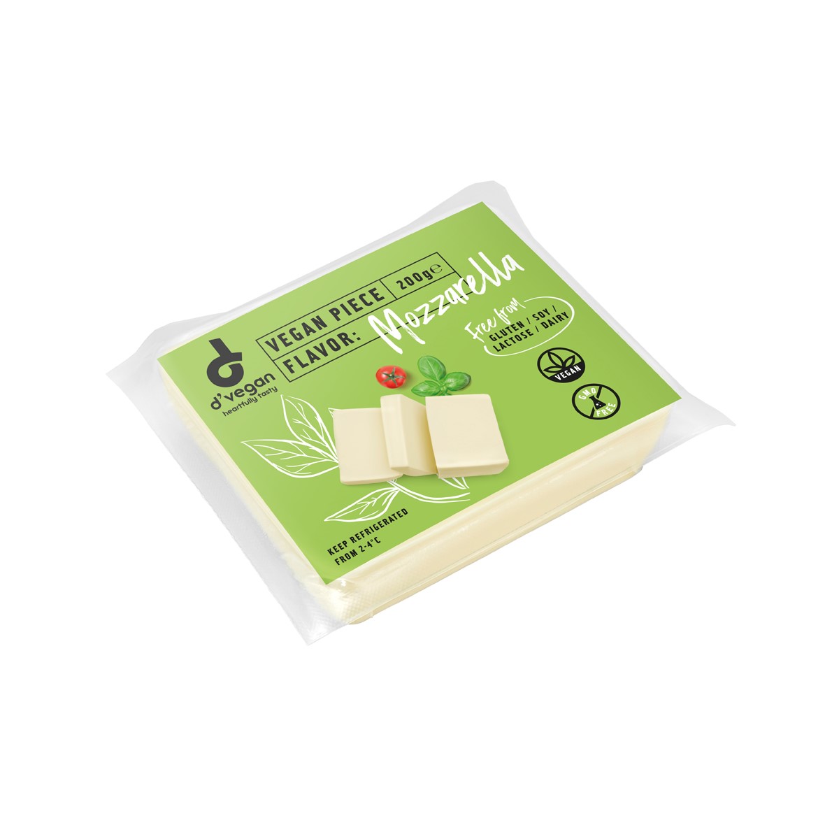 Vegan mozzarella is a non-dairy cheese alternative and has a similar texture to dairy mozzarella. It has a subtle, creamy, mild flavor and slight aroma. It is free from dairy, gluten, GMO, soy, lactose. It is based on Coconut oil and is fortified with Vitamin B12.