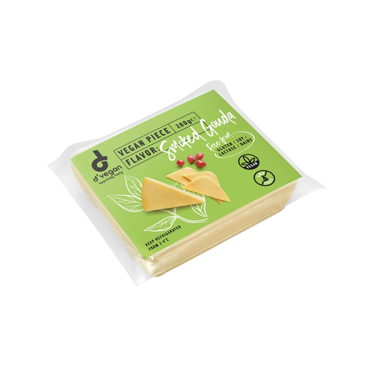 Vegan smoked Gouda is a dairy-free cheese alternative flavored with natural smoke flavoring. It has a golden rind, which forms during the smoking process, a spicy smokey color and a rich creamy yellow core. It is free from dairy, gluten, GMO, soy, lactose. It is based on Coconut oil and is fortified with Vitamin B12.
