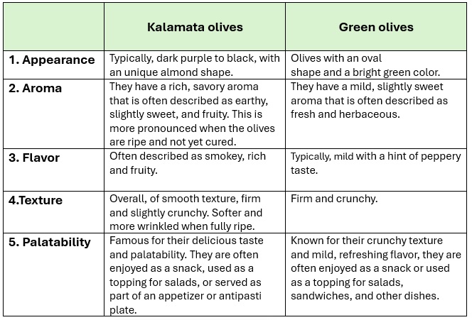 Overall, the organoleptic characteristics of Greek Green & Kalamata olives are shaped by a unique combination of genetics, climate, soil, and processing methods.